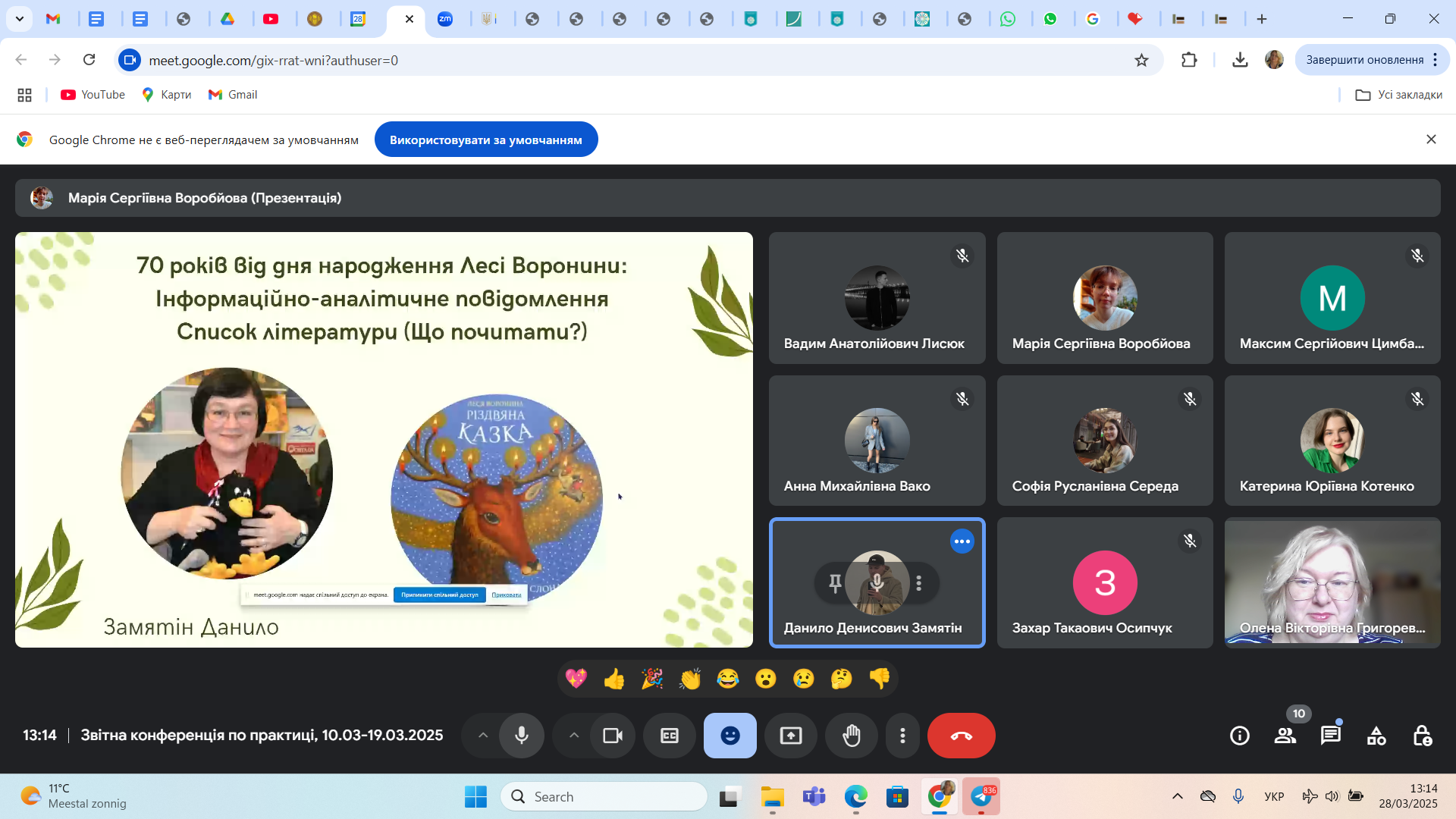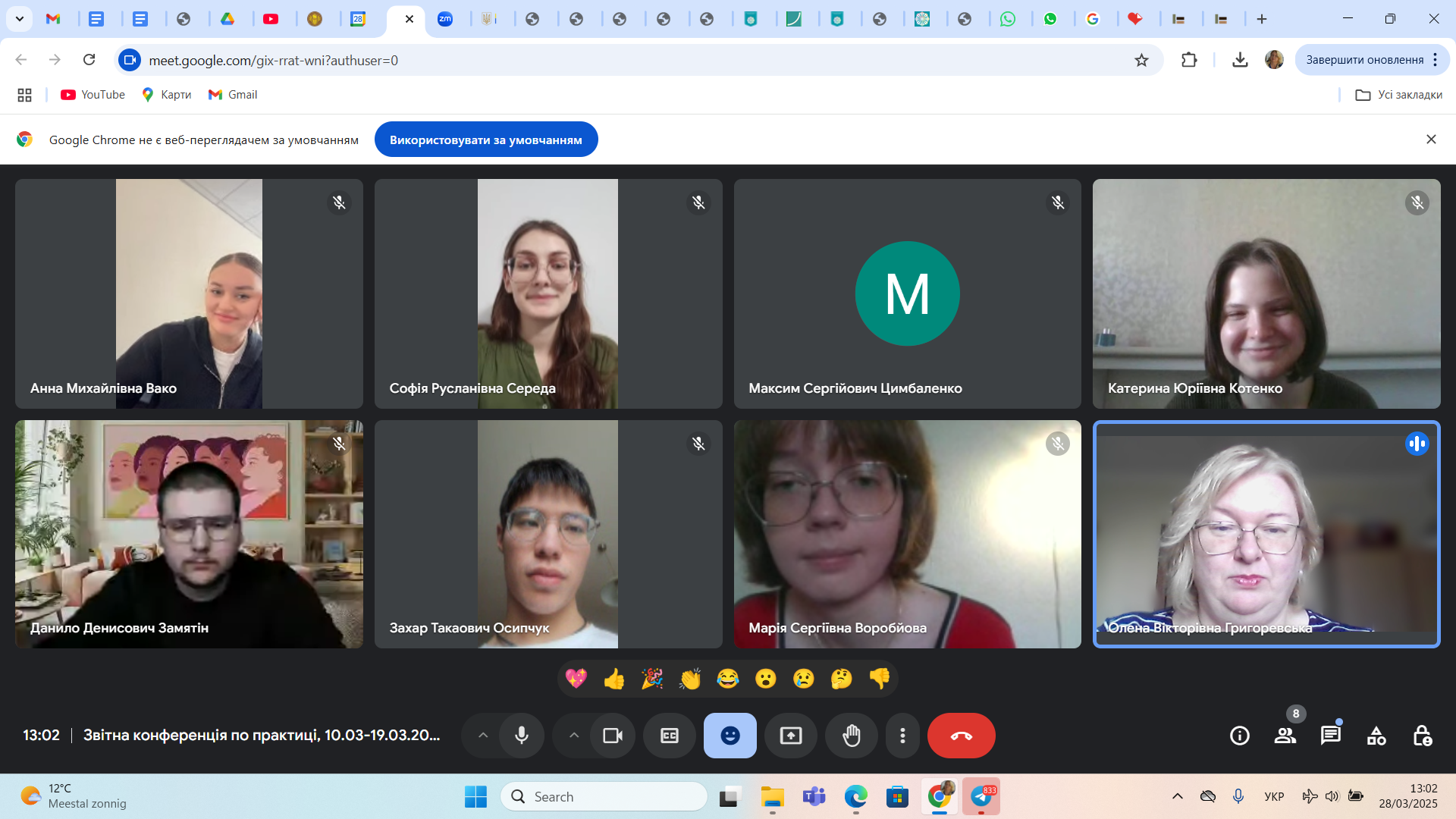 28 березня 2025 р. відбулося обговорення підсумків виробничої (технологічної) практики, яку з 10 по 19 березня 2025 р. проходили здобувачі 4 курсу першого (бакалаврського) рівня вищої освіти денної форми навчання спеціальності 029 Інформаційна, бібліотечна та архівна справа Факультету української філології, культури і мистецтва. Практика відбувалася з урахуванням дистанційного формату на базі Публічної бібліотеки імені Лесі Українки для дорослих м. Києва. Керівники практики: від Університету Грінченка – професор кафедри інформаційних комунікацій Григоревська О.В. і доцент кафедри інформаційних комунікацій Малюк Є.О., від бібліотеки – завідувачка науково-методичного відділу Іванова І.М..