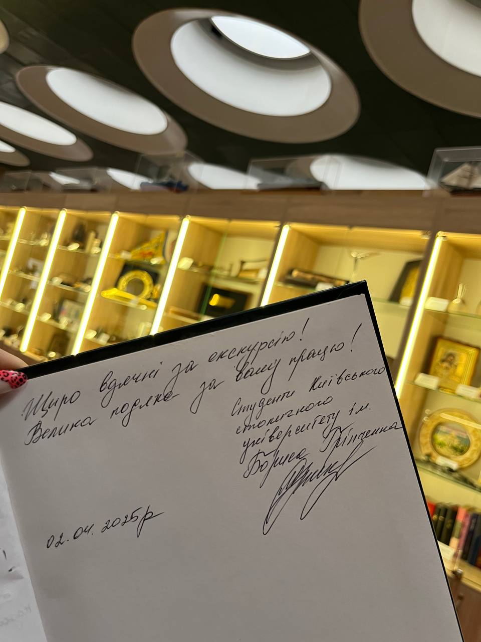 Національна бібліотека України імені В. І. Вернадського має 100-річну історію, є провідним бібліотечно-бібліографічним та науково-інформаційним центром України з понад 16 млн фондом документів. Завдяки професіоналізму завідувачки відділу пошуку та обліку документів Фонду Президентів України Оксани Григорівні Бойко студенти Університету Грінченка отримали вичерпну інформацію та можливість зануритися в історію створення найбільшої бібліотеки України, відвідати її ключові структурні підрозділи, читальні зали та спеціалізовані фонди. Особливі враження на студентів справило ознайомлення з унікальними виданнями, що представлені у відділі картографії, та музейна колекція експонатів Фонду Президентів України. Нагадаємо, що Фонд Президентів України це перше в Україні зібрання документів (видань, архівних документів, кіно-, відео-, фотоматеріалів, електронних видань, баз даних), які відображають процеси становлення та функціонування інституту президентства в Україні та світі.