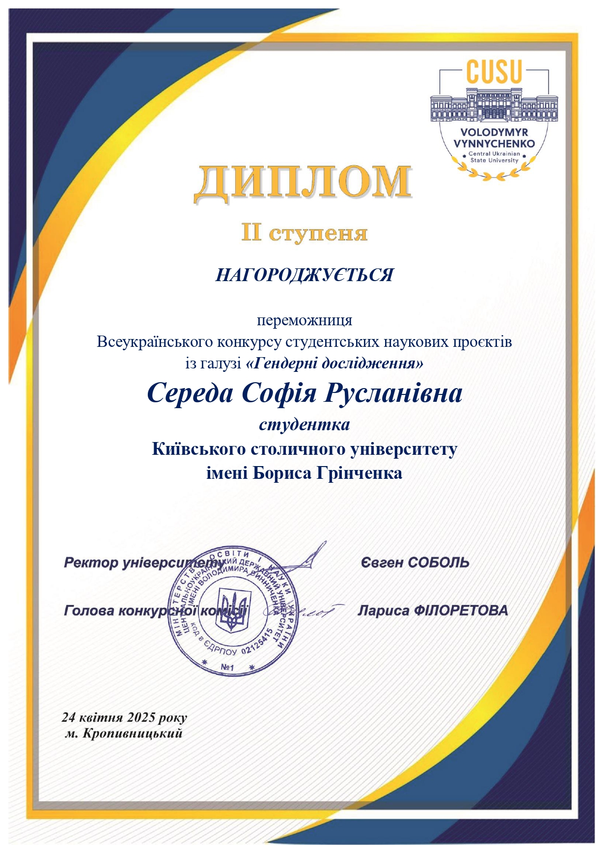 24 квітня 2025 р. на базі Центральноукраїнського державного університету імені Володимира Винниченка відбулася підсумкова науково-практична конференція Всеукраїнського конкурсу студентських наукових проєктів із галузі «Гендерні дослідження» з-поміж студентів закладів вищої освіти України.