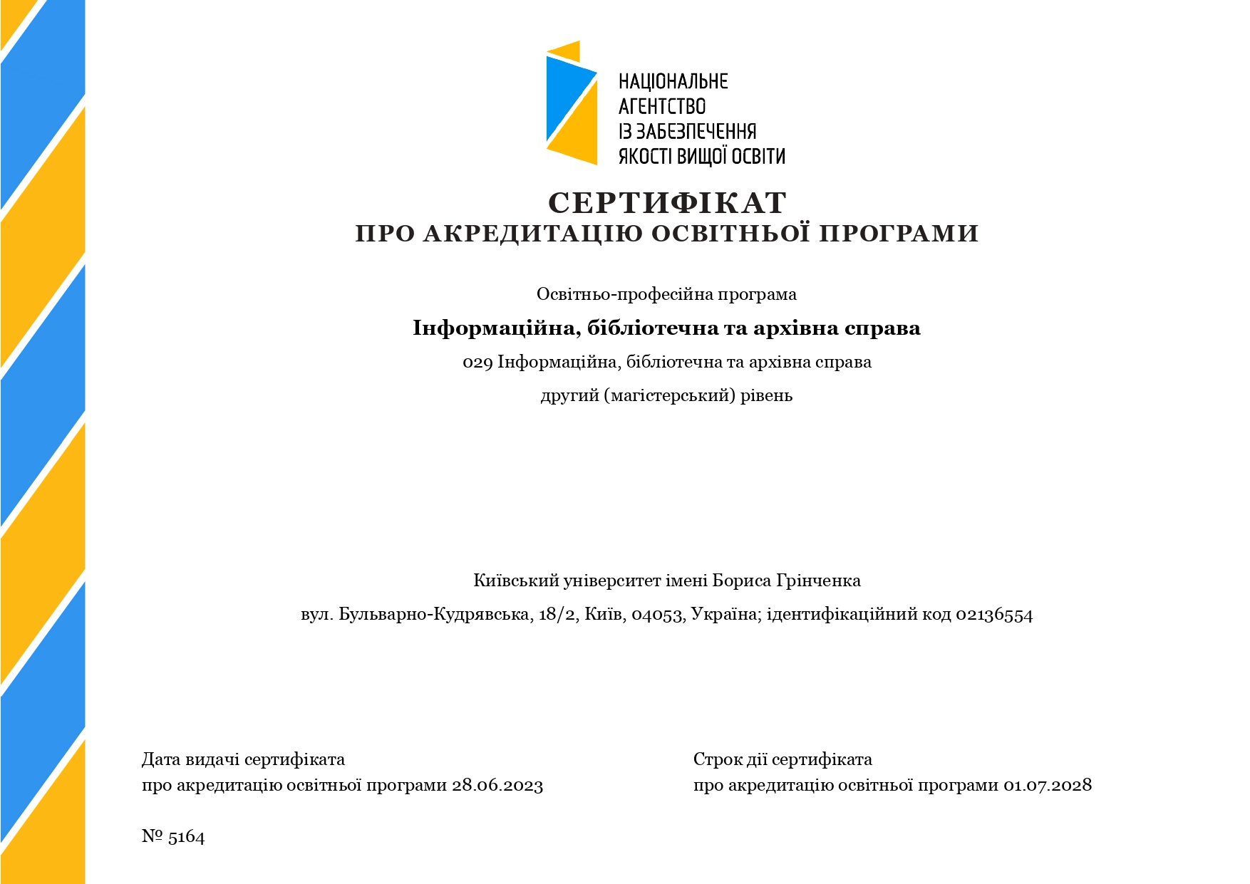 28 червня 2023 р. рішенням Національного агенства із забезпечення якості вищої освіти видано сертифікат №5164 про акредитацію освітньо-професійної програми другого (магістерського) рівня вищої освіти 029.00.02 «Інформаційна, бібліотечна та архівна справа», яка реалізується кафедрою інформаційних комунікацій Факультету української філології, культури і мистецтва в Київському університеті імені Бориса Грінченка.