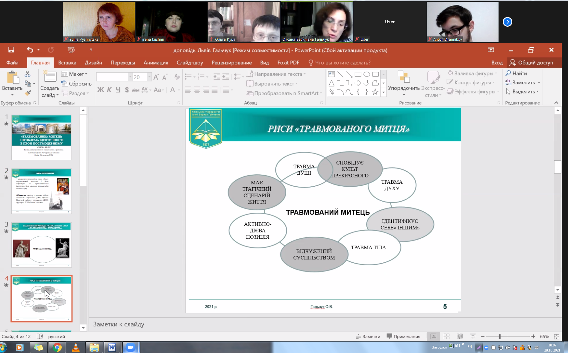 Чи не найбільш чисельною за кількістю учасників була секція «Ідентичність і пам'ять в літературі», де керівником підсекції «Виміри ідентичності» була професор кафедри світової літератури Київського університету імені Бориса Грінченка Оксана Гальчук (тема доповіді «Травмований митець» і проблема ідентичності в прозі постмодернізму»). Виступи українських дослідників Ольги Куцої («Концепт батько/родина у трагічному натхненні Ульфа Старка»), Василини Хоми («Виміри діаспорної ідентичності в мемуарах Майкла Ондатже «У колі сім’ї»), Ірини Кушнір («Етнокультуна швейцарська ідентичність на прикладі творчості Ш.-Ф. Рамюза»), Антона Драннікова («Час і простір екзистенційної самотності в романі К. Ішервуда «Самотній чоловік»), Наталії Романишин («Концептуальні домінанти національної ідентичності в поетичному дискурсі англійського романтизму: антропоцентричний ракурс осмислення») супроводжувались жвавою дискусією, цікавими спостереженнями, свіжими ідеями.
