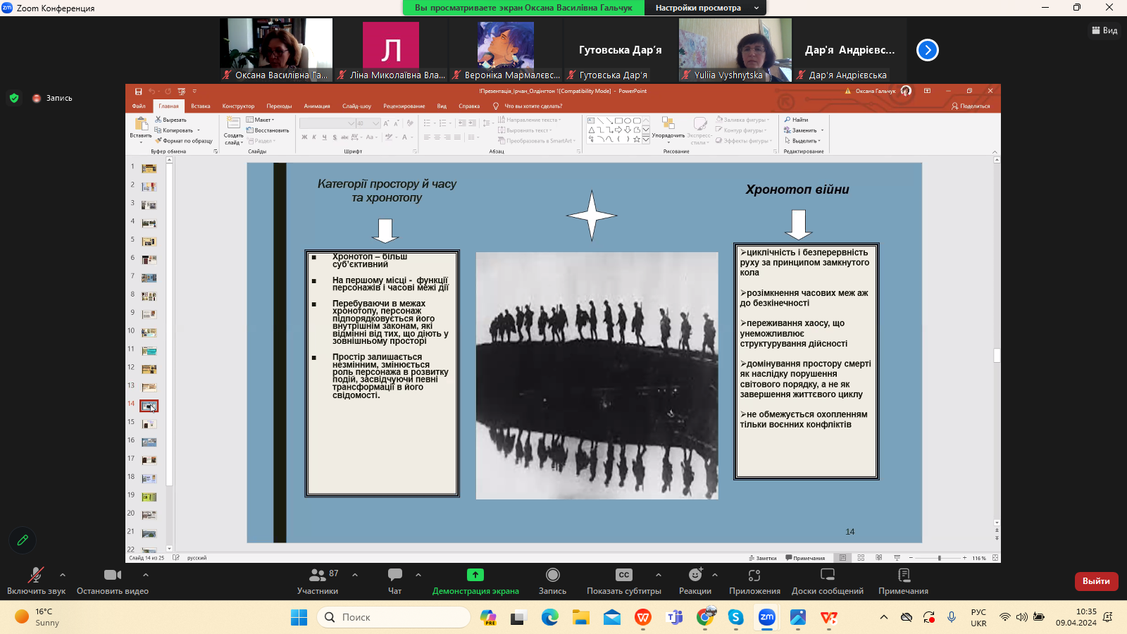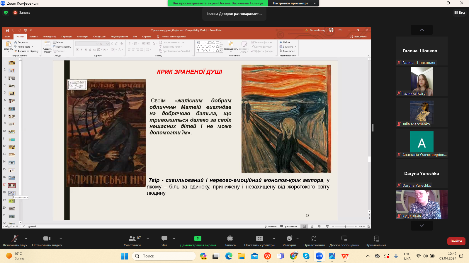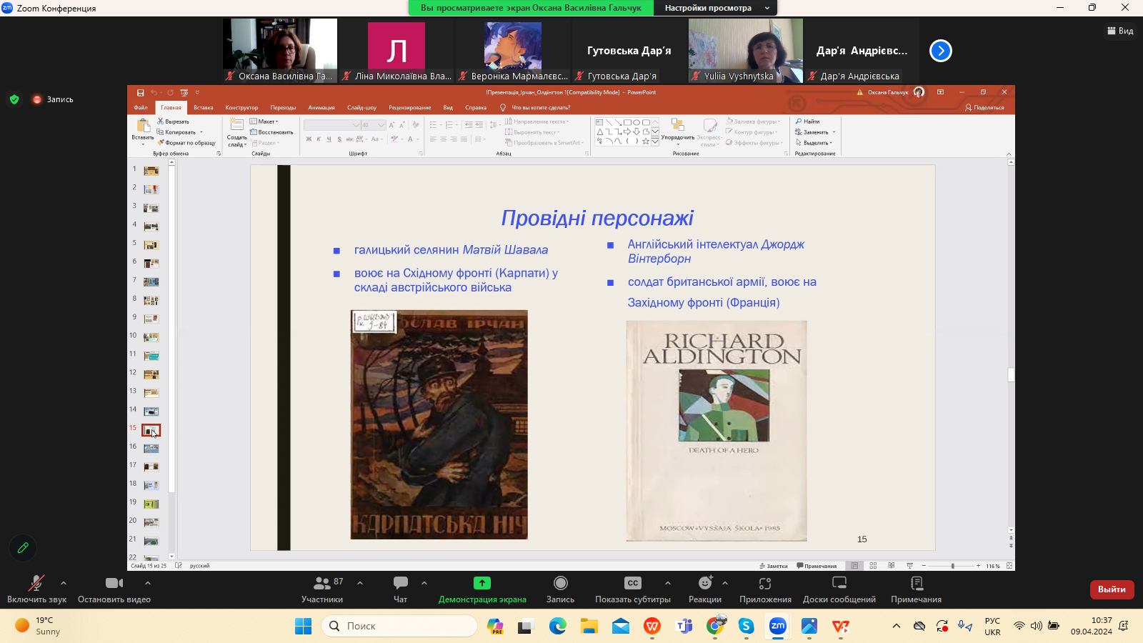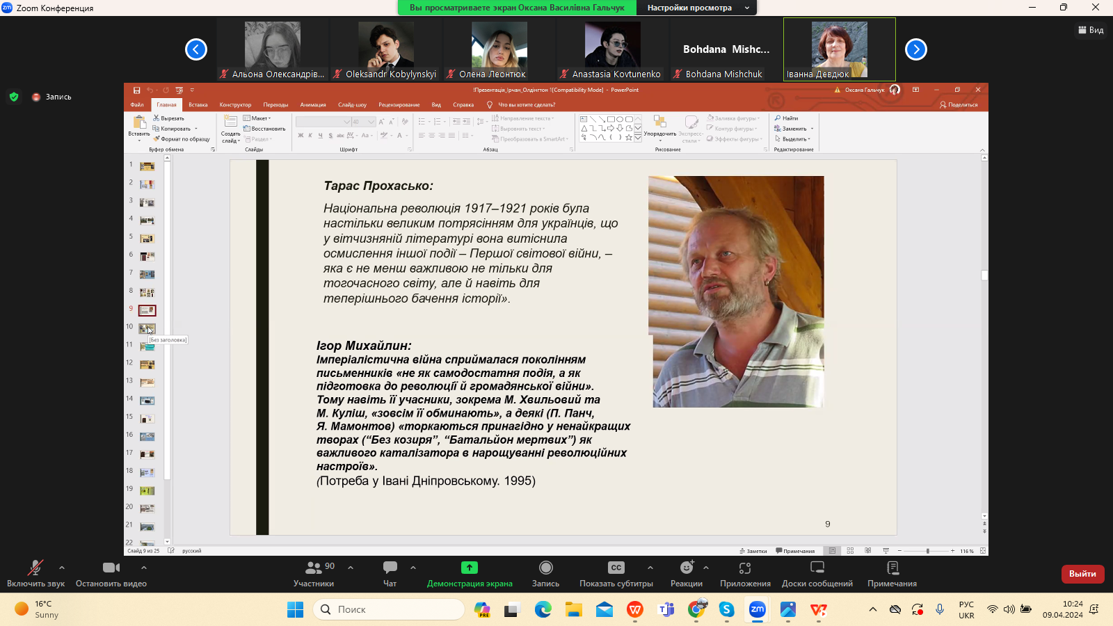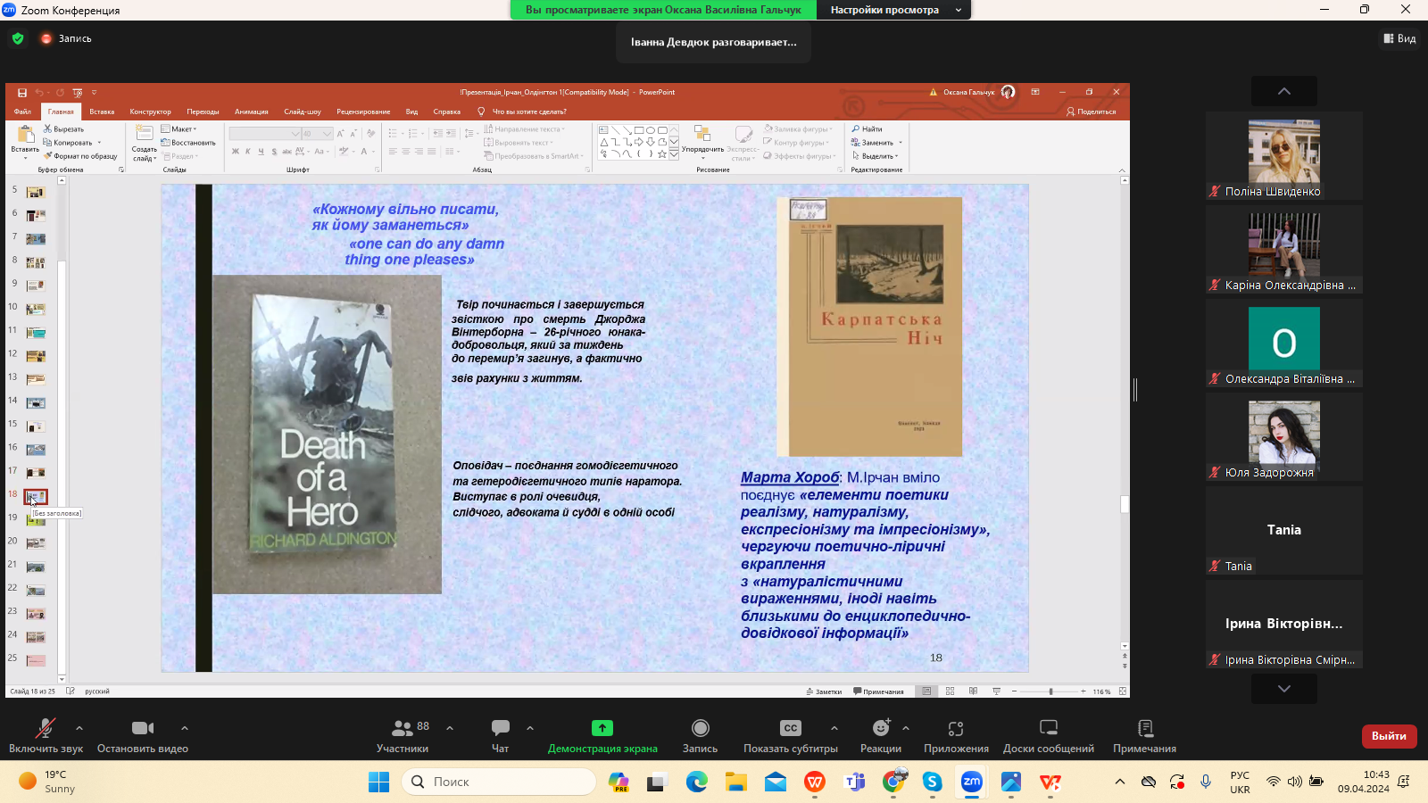 9 квітня 2024 р. в межах програми Дня Факультету української філології, культури і мистецтва відбулася гостьова лекція доктора філологічних наук, професора кафедри зарубіжної літератури Прикарпатського національного університету імені Василя Стефаника Іванни Девдюк “Хронотоп війни: художні візії Мирослава Ірчана і Річарда Олдінгтона".