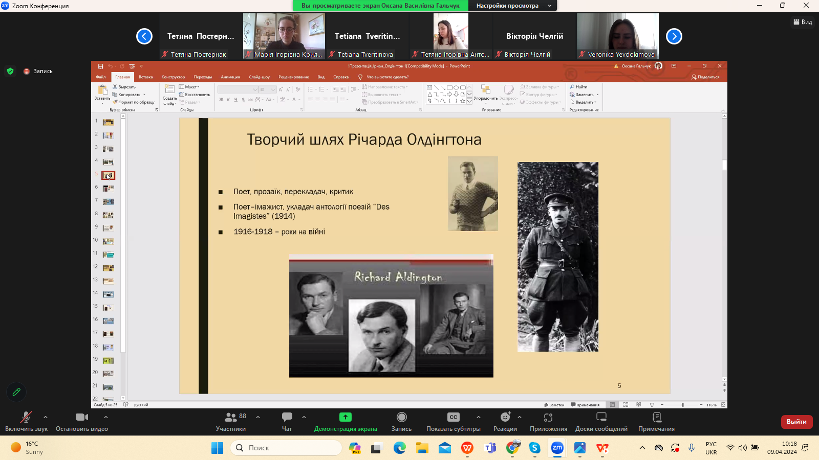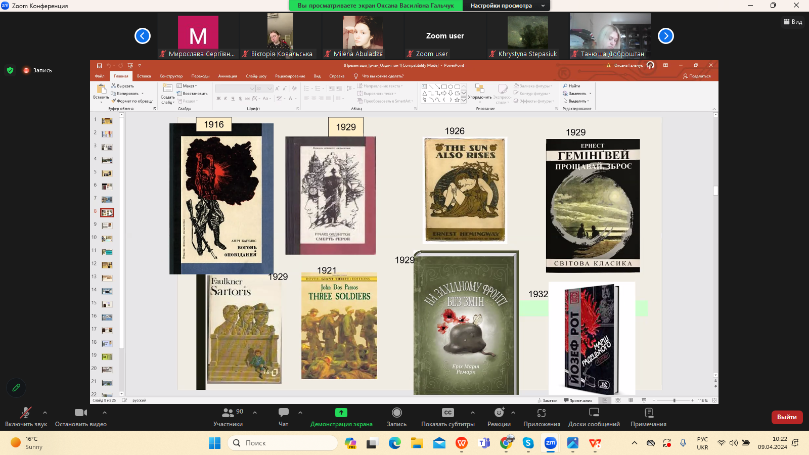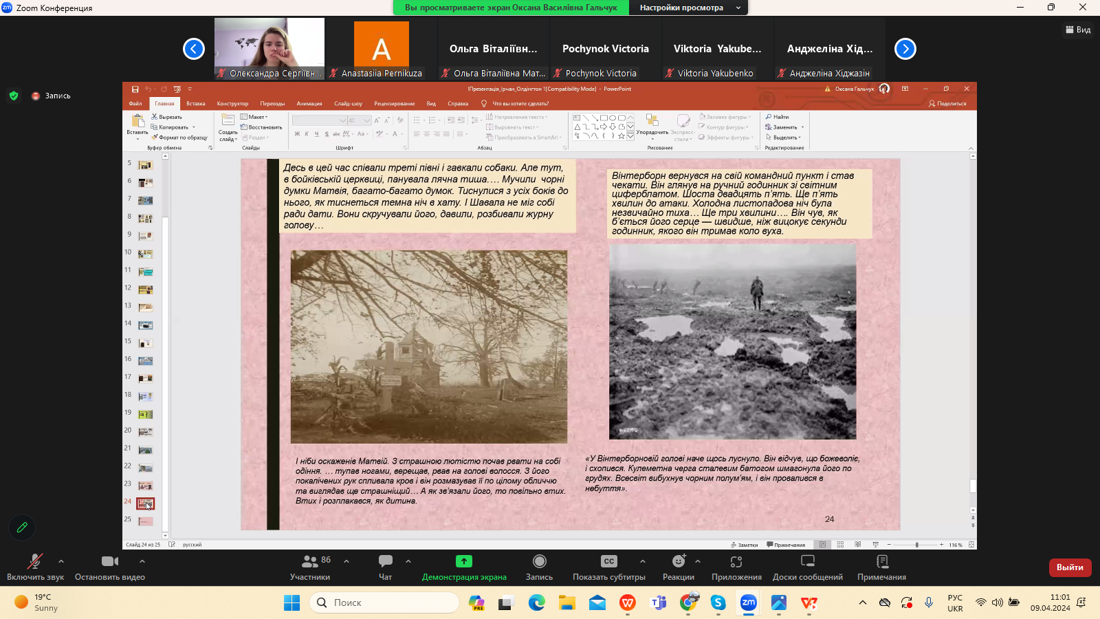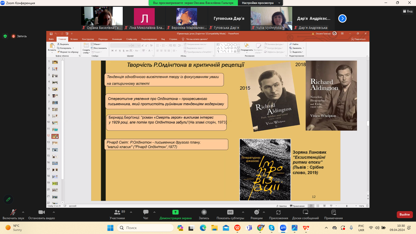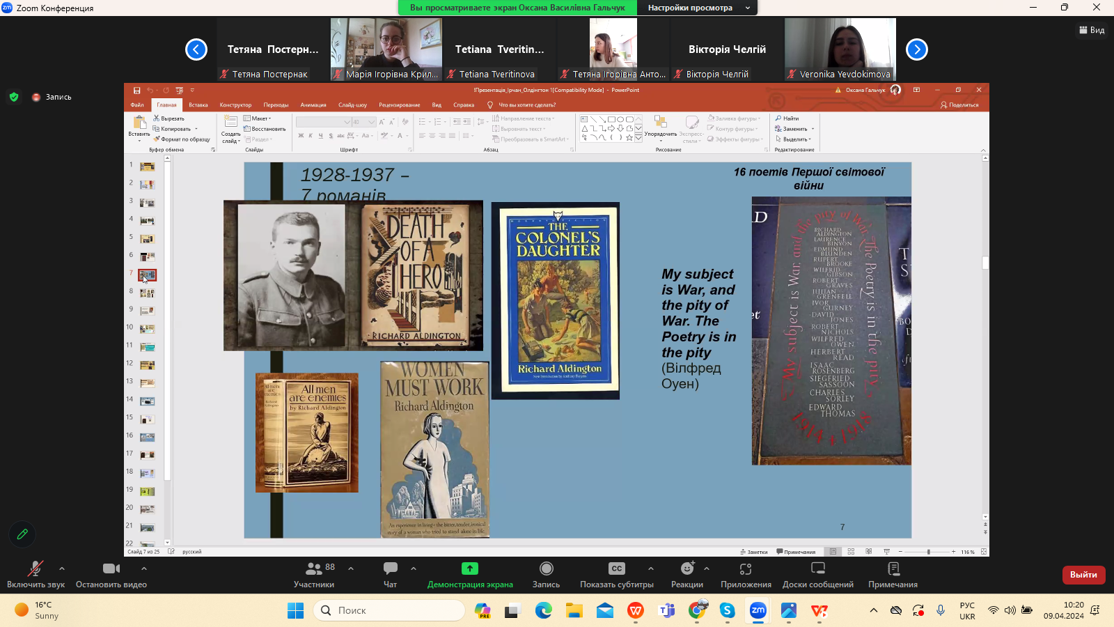 9 квітня 2024 р. в межах програми Дня Факультету української філології, культури і мистецтва відбулася гостьова лекція доктора філологічних наук, професора кафедри зарубіжної літератури Прикарпатського національного університету імені Василя Стефаника Іванни Девдюк “Хронотоп війни: художні візії Мирослава Ірчана і Річарда Олдінгтона".