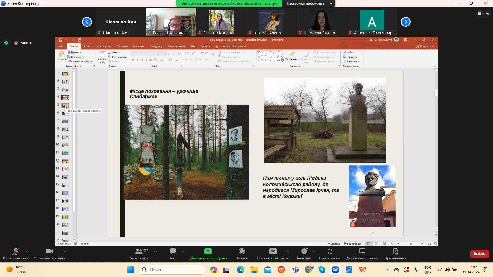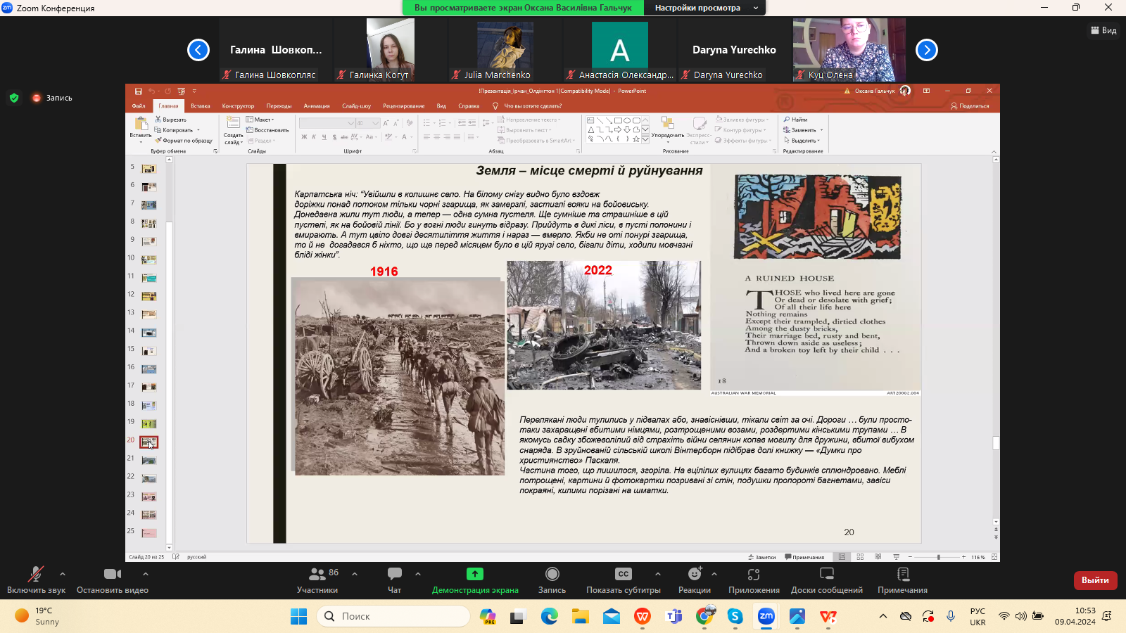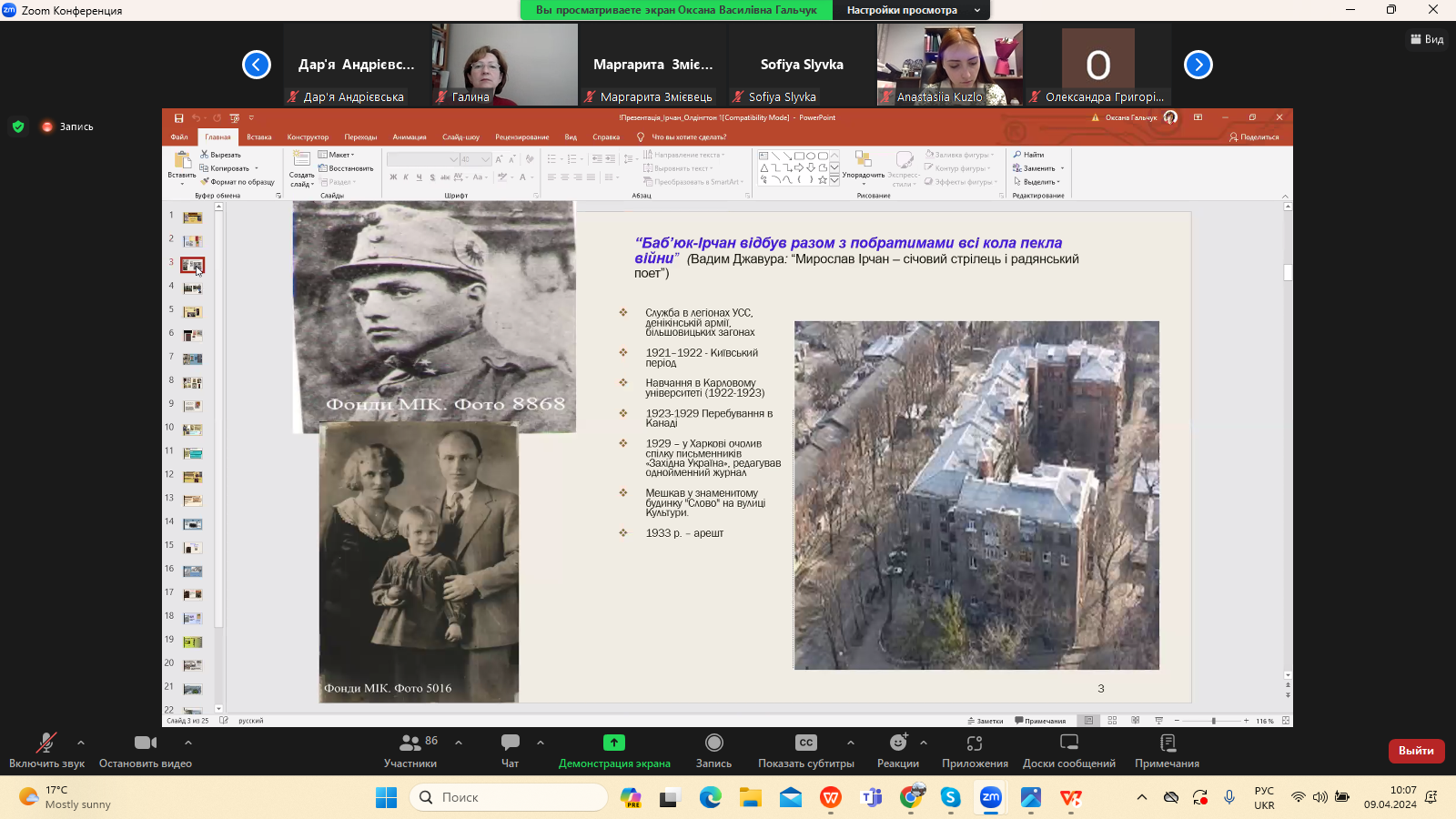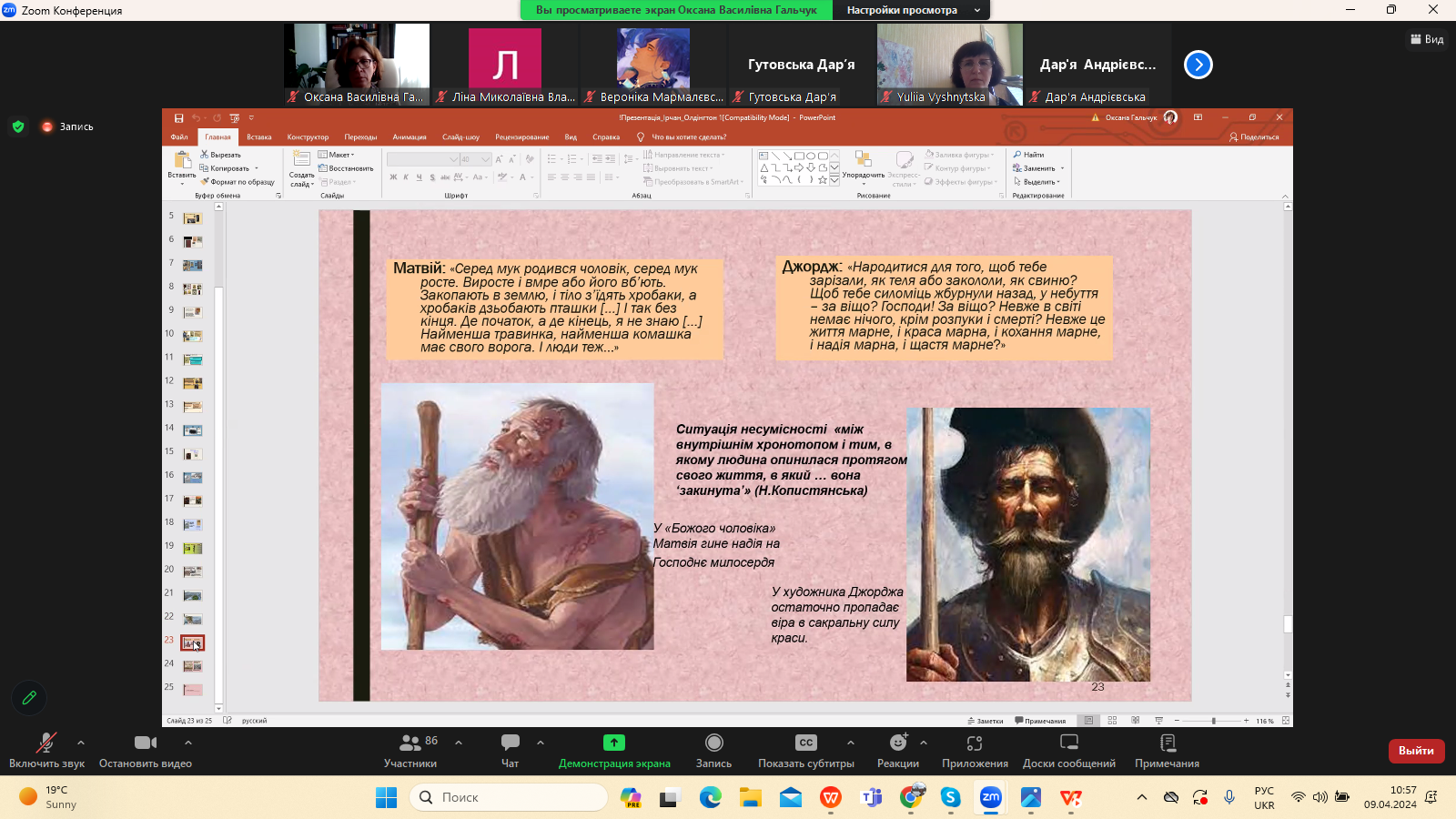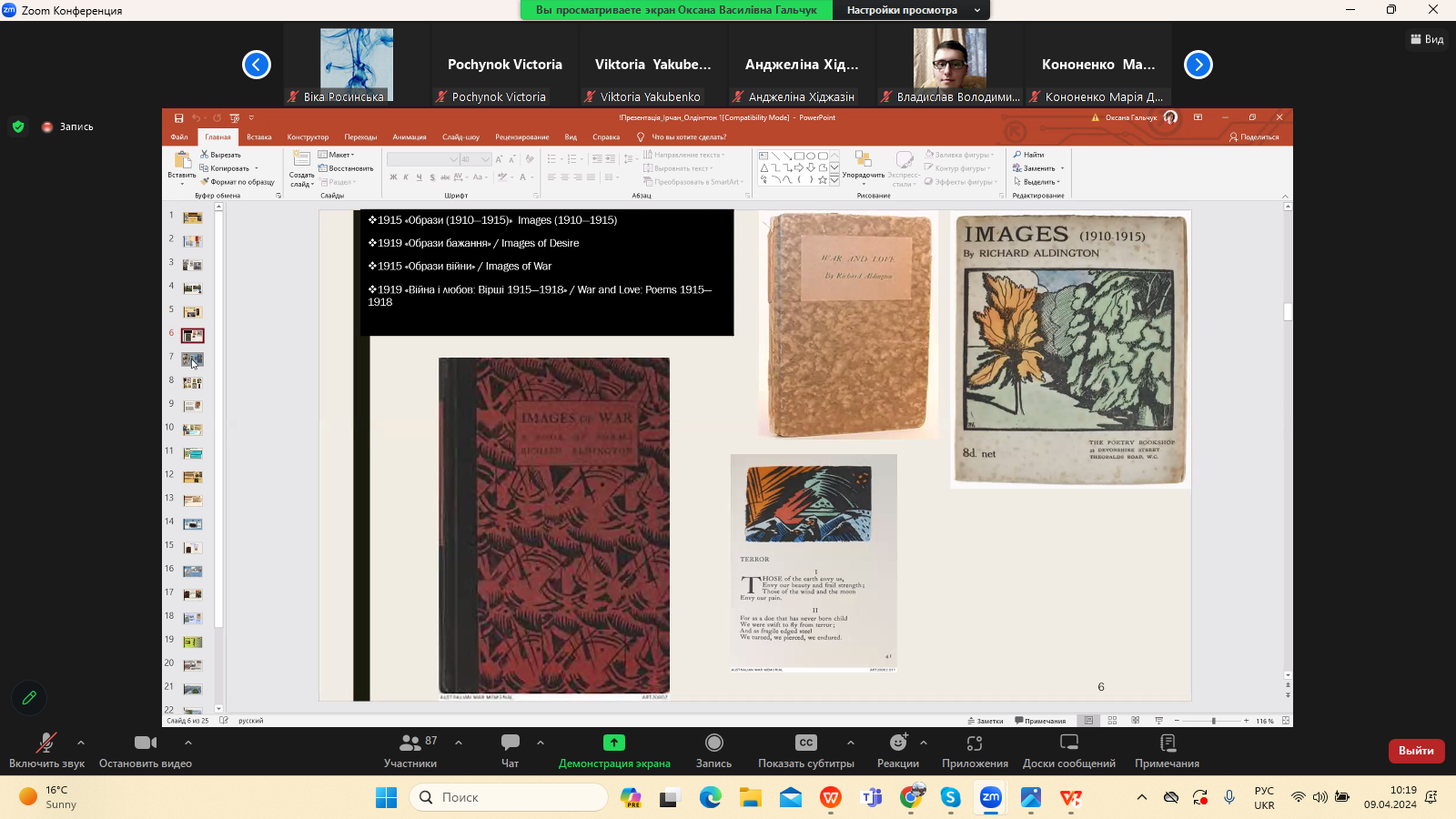 9 квітня 2024 р. в межах програми Дня Факультету української філології, культури і мистецтва відбулася гостьова лекція доктора філологічних наук, професора кафедри зарубіжної літератури Прикарпатського національного університету імені Василя Стефаника Іванни Девдюк “Хронотоп війни: художні візії Мирослава Ірчана і Річарда Олдінгтона".