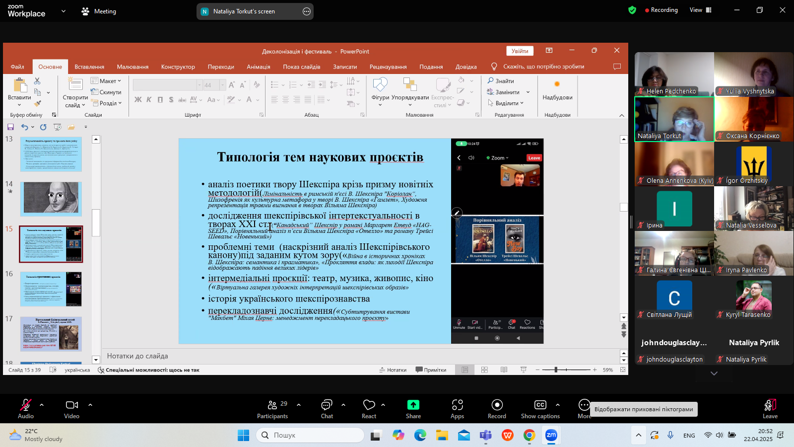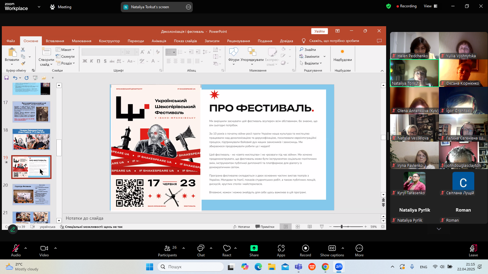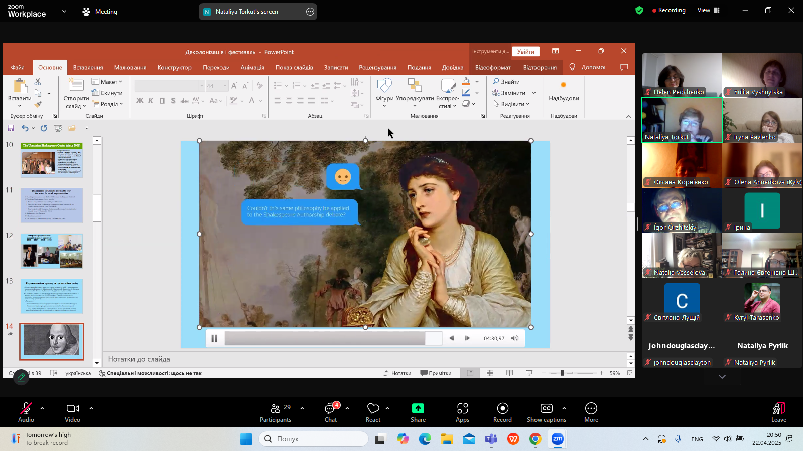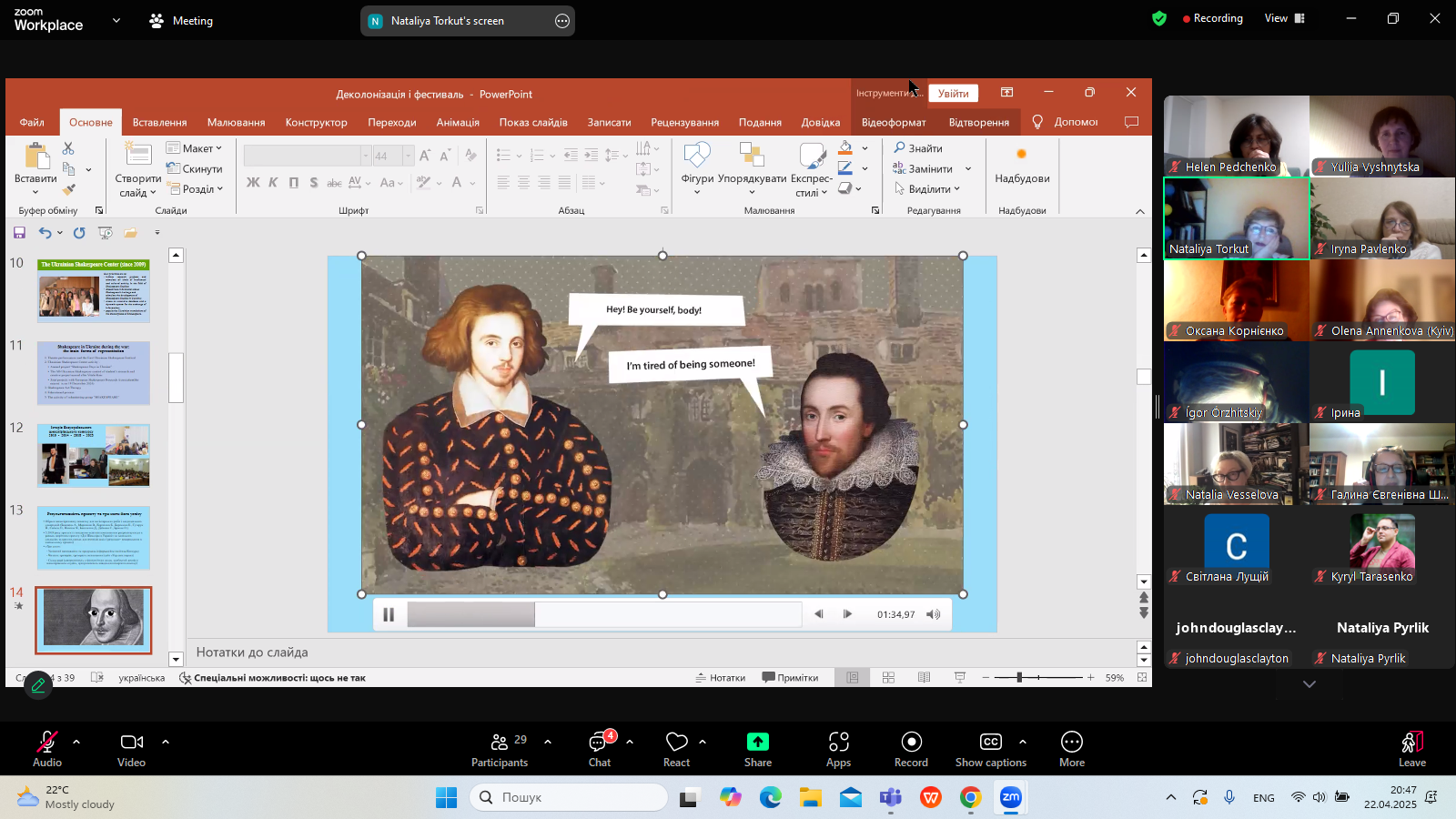 22 квітня 2025 р. всі охочі - залюблені в Шекспіра і ті, хто лише відкриває для себе Великого Барда - мали змогу відвідати онлайн-лекцію доктора філологічних наук, професора Запорізького національного університету, засновниці й очільниці Українського шекспірівського центру, академіка Академії наук вищої школи України, членкині Європейської асоціації шекспірознавців (ESRA), професора Наталії Торкут.