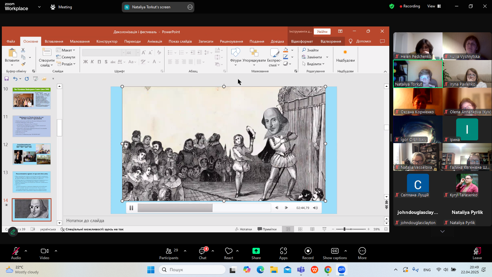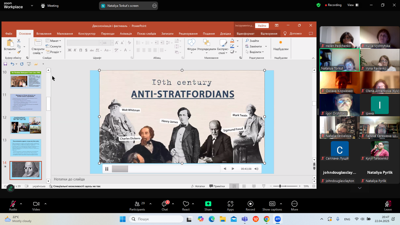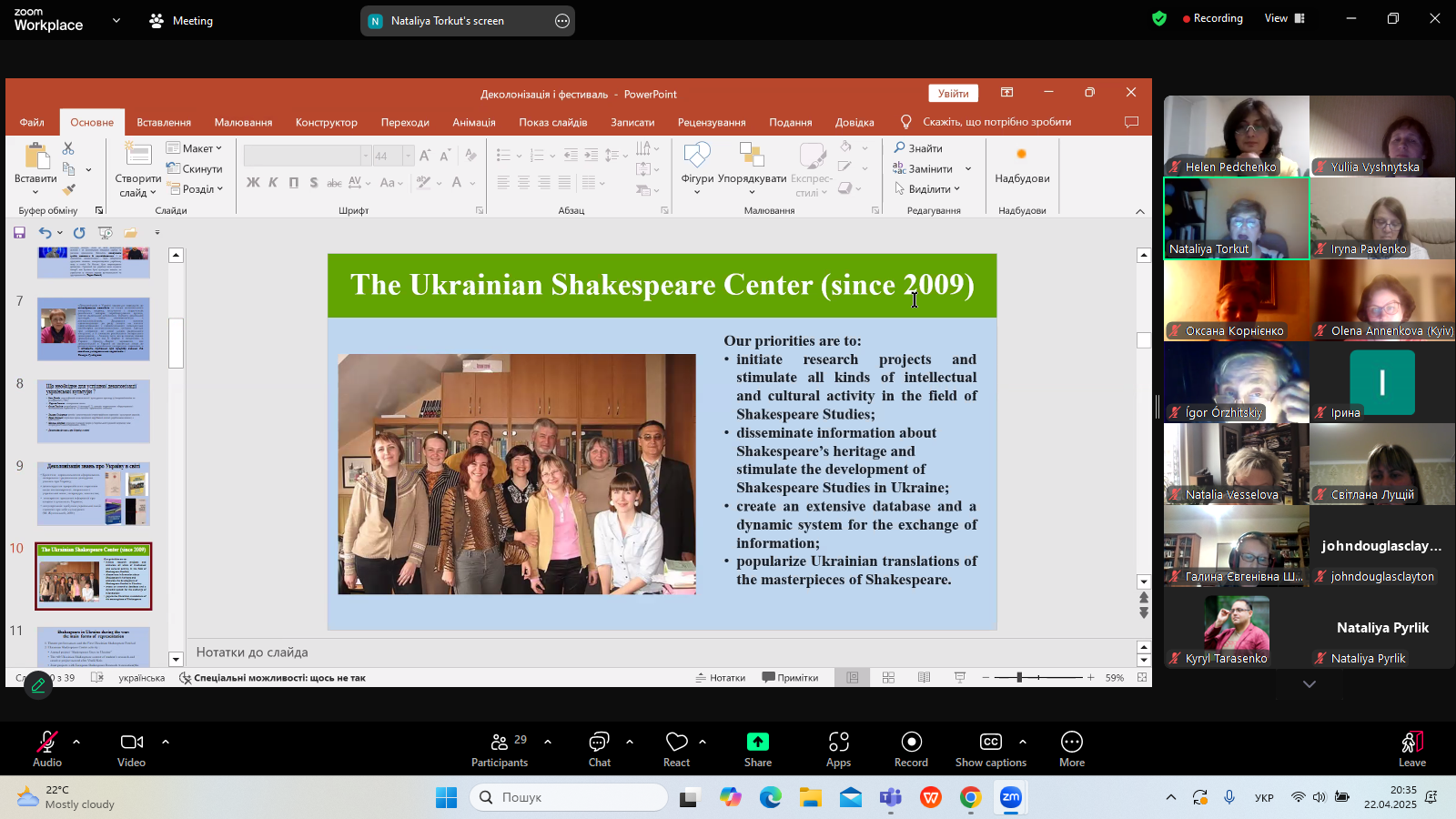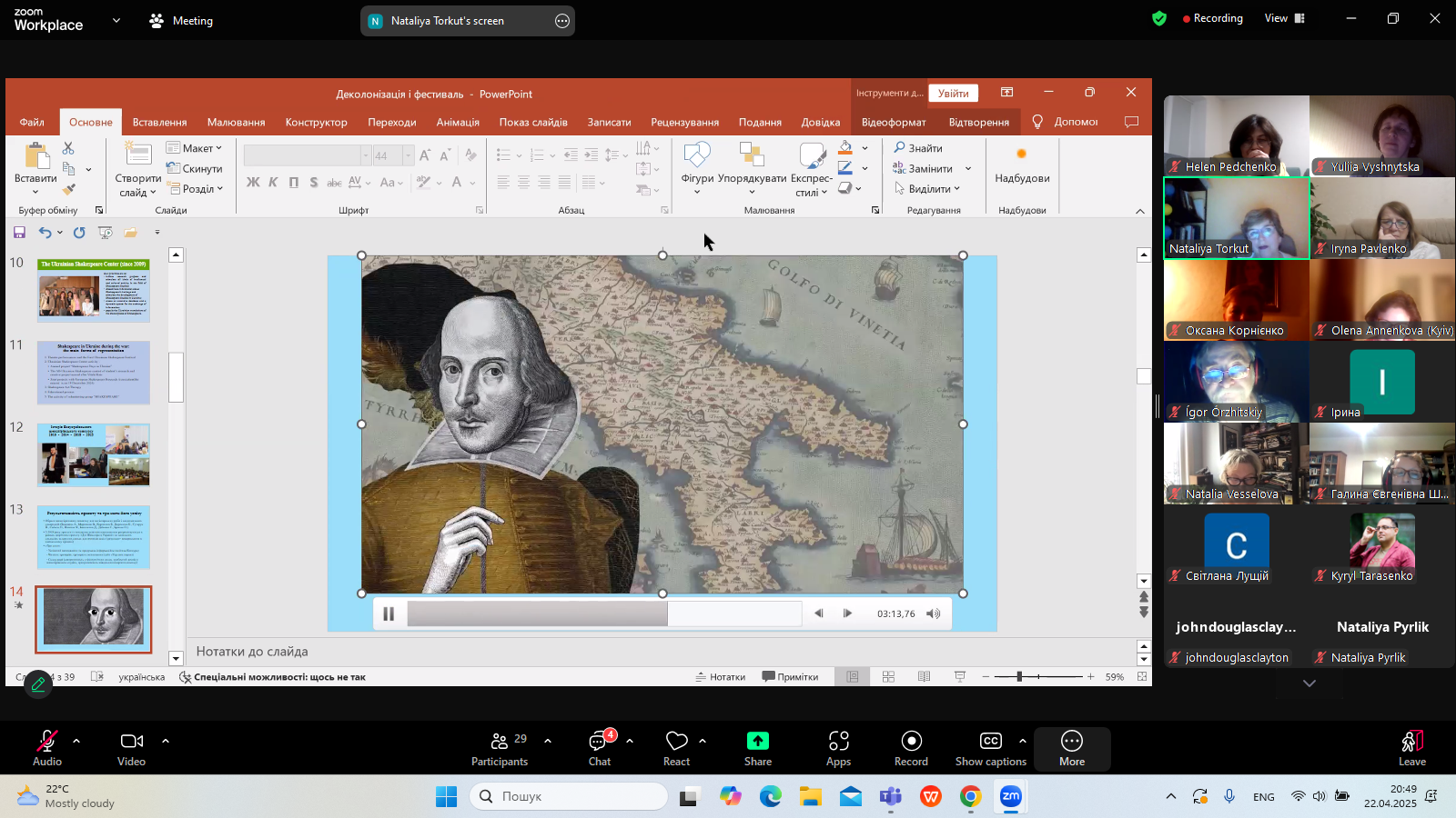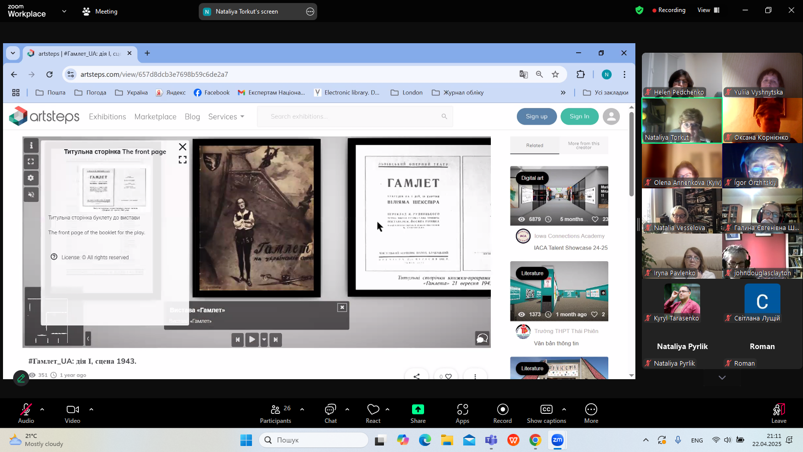 22 квітня 2025 р. всі охочі - залюблені в Шекспіра і ті, хто лише відкриває для себе Великого Барда - мали змогу відвідати онлайн-лекцію доктора філологічних наук, професора Запорізького національного університету, засновниці й очільниці Українського шекспірівського центру, академіка Академії наук вищої школи України, членкині Європейської асоціації шекспірознавців (ESRA), професора Наталії Торкут.