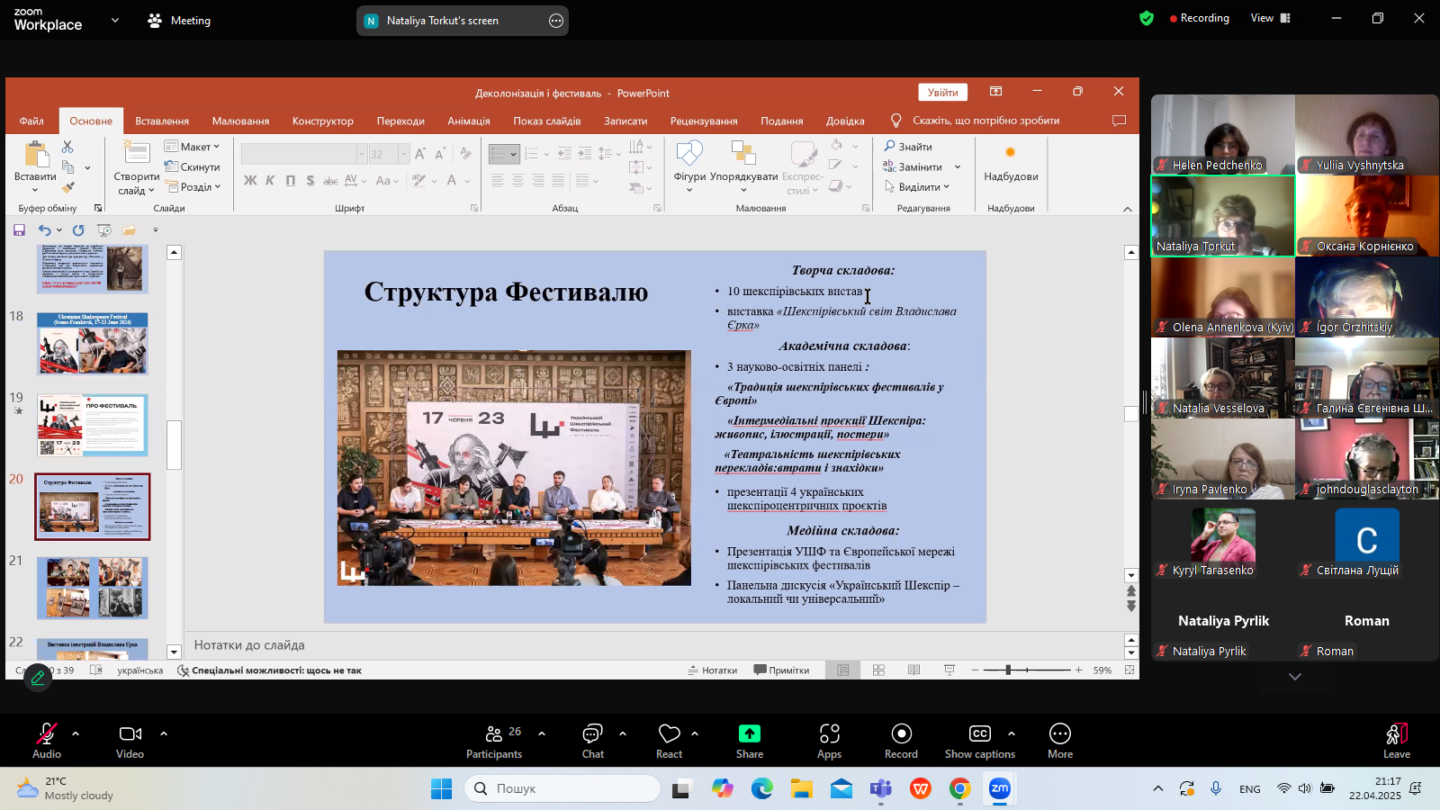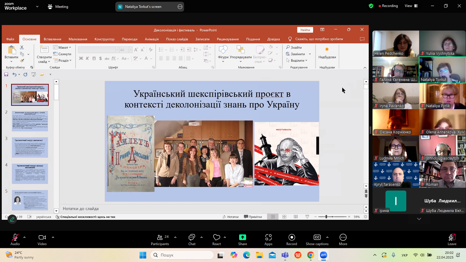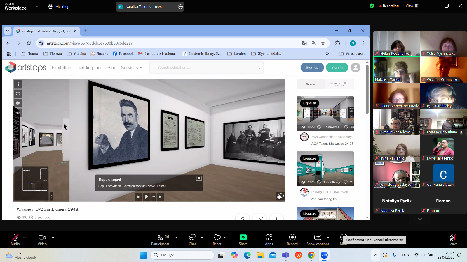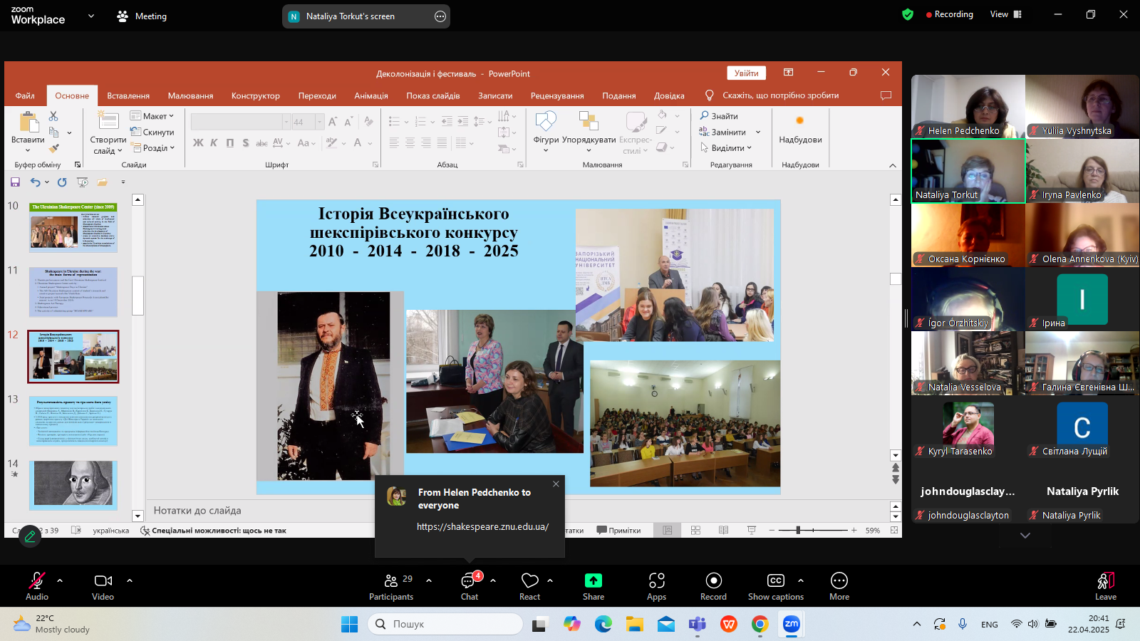 22 квітня 2025 р. всі охочі - залюблені в Шекспіра і ті, хто лише відкриває для себе Великого Барда - мали змогу відвідати онлайн-лекцію доктора філологічних наук, професора Запорізького національного університету, засновниці й очільниці Українського шекспірівського центру, академіка Академії наук вищої школи України, членкині Європейської асоціації шекспірознавців (ESRA), професора Наталії Торкут.