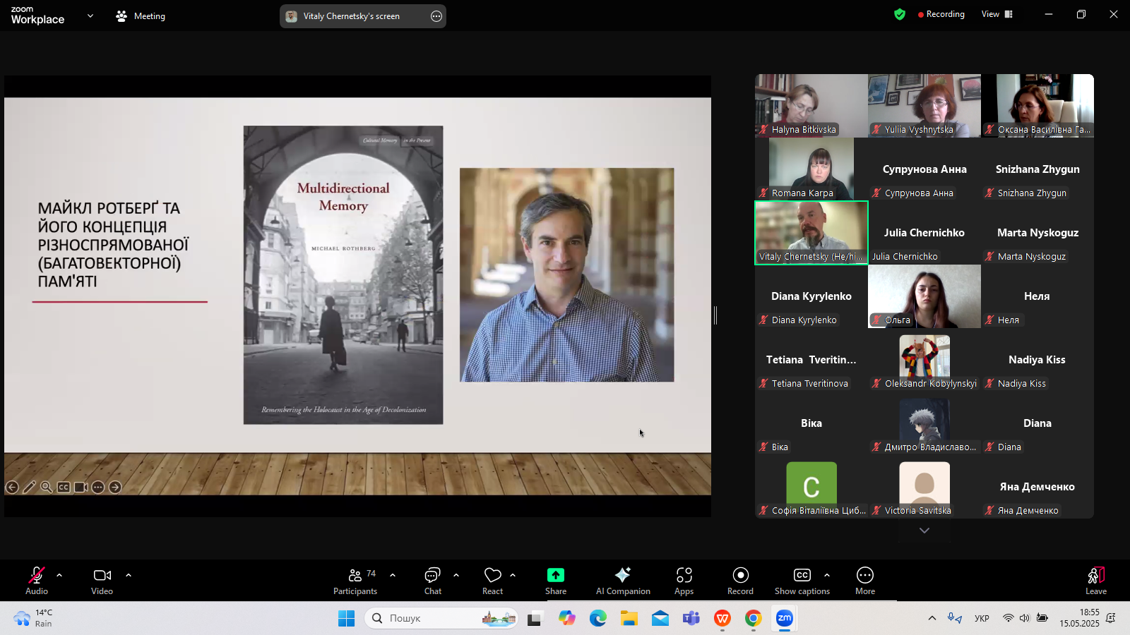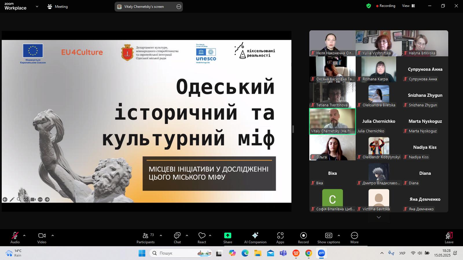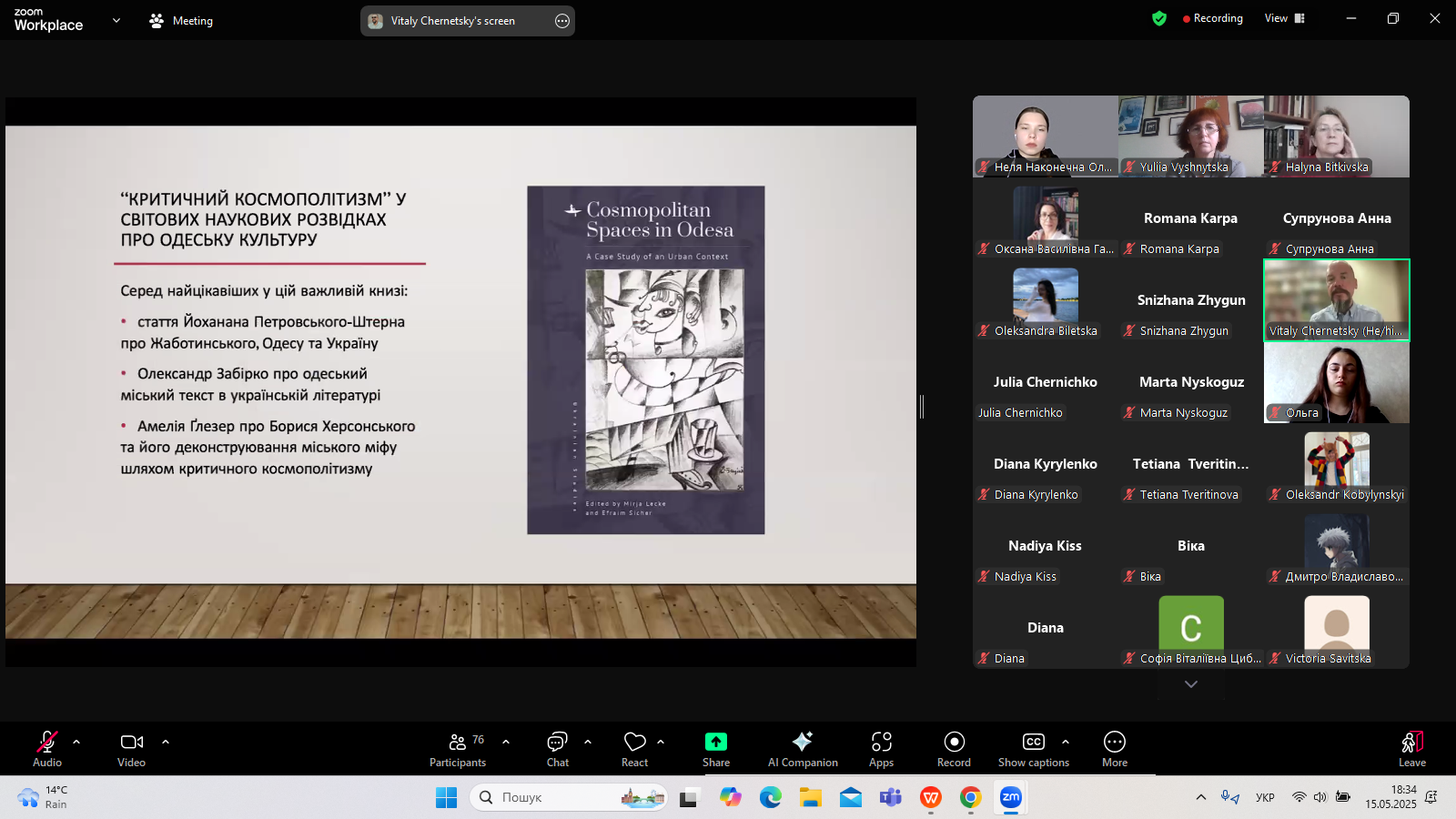 Професор В. Чернецький розповів про концепцію різноспрямованої пам’яті Майкла Ротберга; про домінуючі міфи і стереотипи щодо Одеси і їх переосмислення; представив і проаналізував сучасні наукові розвідки, поезію, прозу, виставки картин і музику, що присвячені Одесі, а також торкнувся багатьох інших цікавих аспектів.