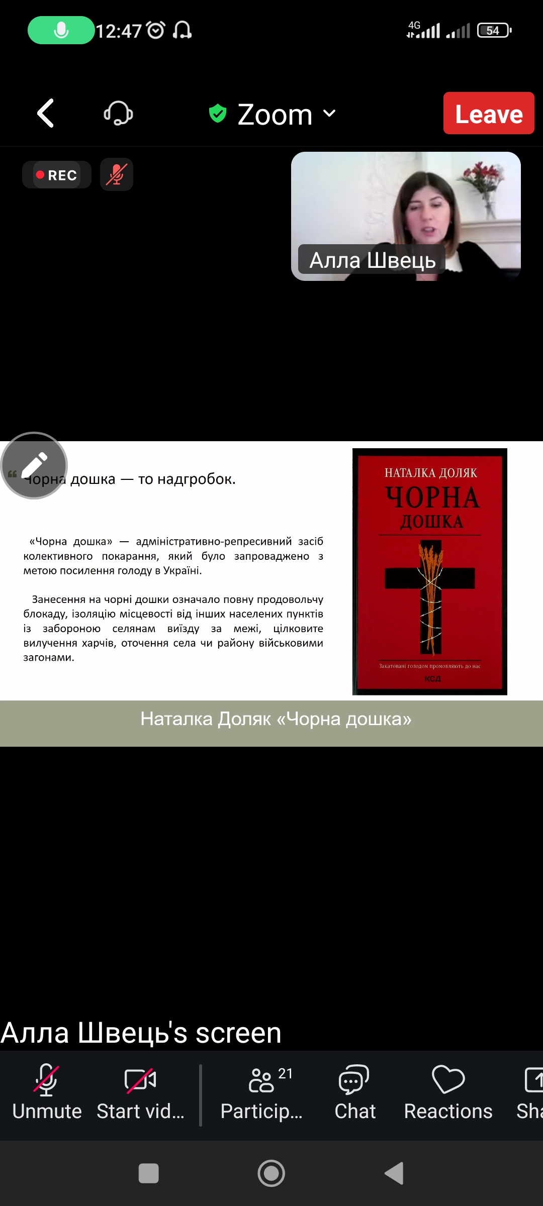 Бакалаври і магістри, науково-педагогічні працівники кафедри із захопленням прослухали змістовну і віртуозно вибудовану лекцію, де на прикладі романів Світлани Талан «Розколоте небо», Наталки Доляк «Чорна дошка» і Тетяни Пʼянкової «Вік червоних мурах» була запропонована аналітика авторських інтерпретацій теми Голодомору в сучасній українській жіночій прозі, визначено проблематику і стилістичні особливості романів, окреслено специфіку жіночого наративу Голодомору як злочину совєцької імперії проти поневоленої України. Ефект почутого підсилював вдало підібраний візуальний супровід – репродукції картини, на яких закарбований жах 1933 року.