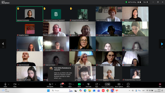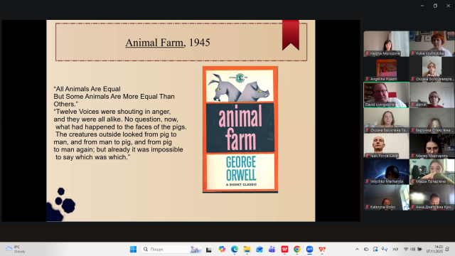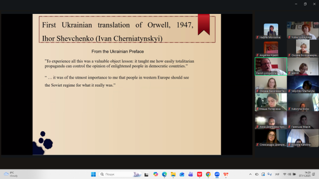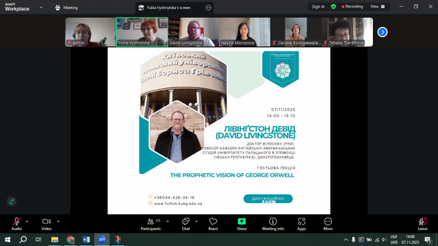 7 листопада 2025 р. з нагоди Міжнародного дня науки на Факультеті української філології, культури і мистецтва відбулася гостьова лекція професора Девіда Лівінгстона «Пророче бачення Джорджа Орвелла». David Livingstone – професор кафедри англійських та американських студій Факультету мистецтв Університету Палацького в місті Оломоуці (Чехія), шекспірознавець, викладач авторських курсів, зокрема, з британської літератури, американської фольк-музики.